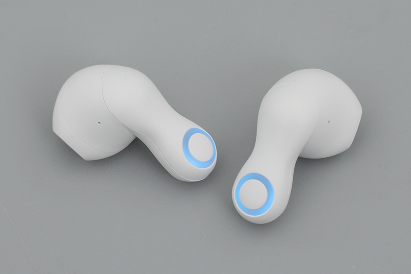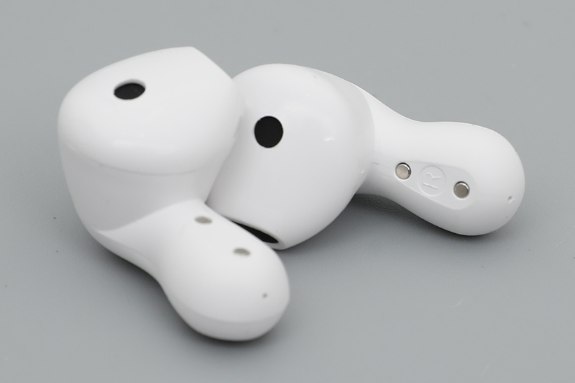 충전 케이스를 열면 좌우 이어버드가 수납되어 있다. 이어버드와 충전 케이스는 모두 화이트 단일 색상으로 출시되었다.