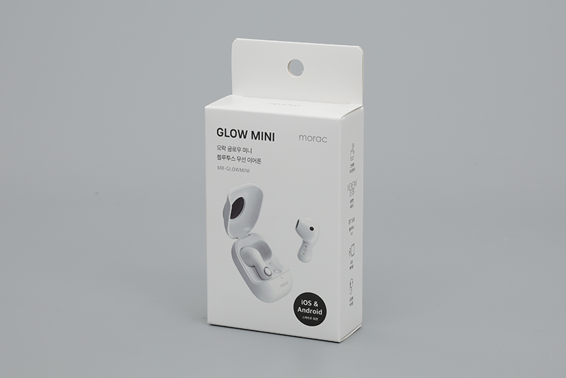 모락 글로우 미니 블루투스 무선 이어폰 MR-GLOWMINI는 아담한 크기의 흰색 박스에 담겨있다. 박스 앞면에는 제품의 이미지가 인쇄되어 있어서 개봉 전에도 대략의 디자인을 확인할 수 있다.