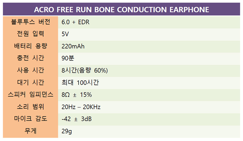 구성품으로는 ACRO 프리런 골전도 무선이어폰 MI6-9 본체와 충전용 USB 케이블, 검은색 실리콘 밴드, 그리고 사용 설명서가 제공되고 있다.