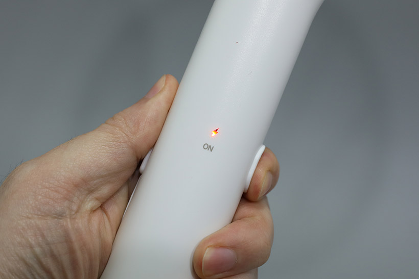 아이랩 전기모기채 iLAB-EMR의 손잡이 가운데 부분에는 번개 모양의 LED 인디케이터가 있으며, 바로 아래 ON이라는 글자가 인쇄되어 있어서 작동 표시임을 알 수 있다.