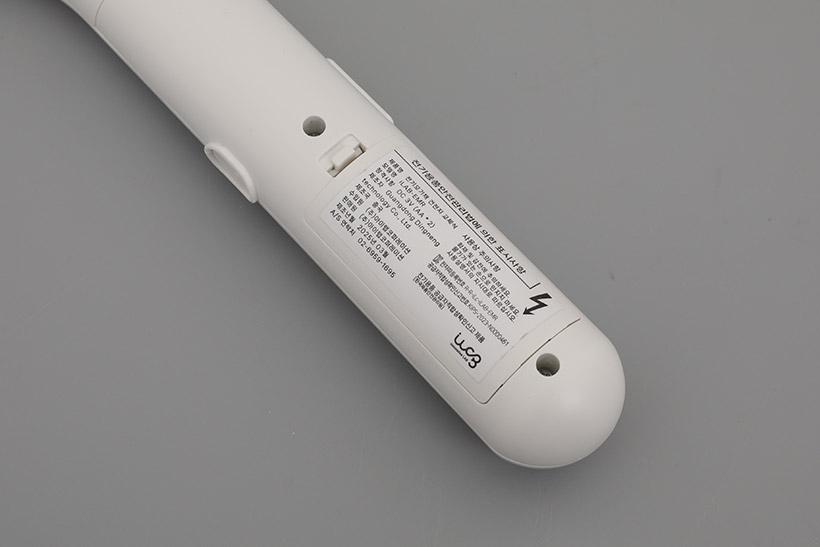 손잡이 부분 뒷면을 보면 배터리 커버 위에 제품의 모델명과 인증 정보 등이 인쇄된 스티커가 부착되어 있다.