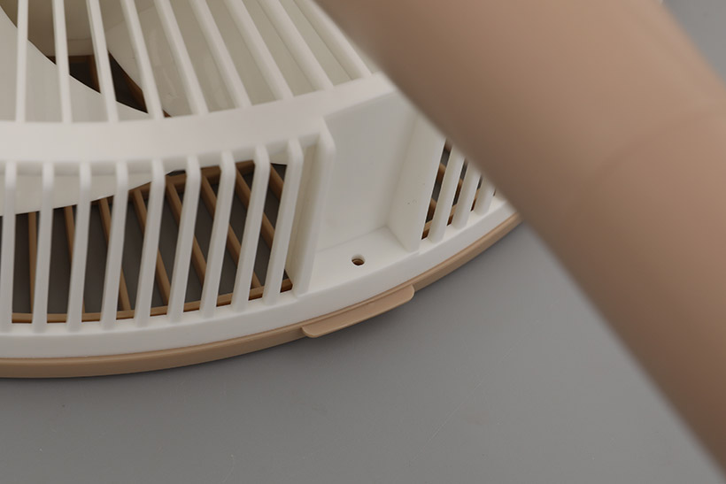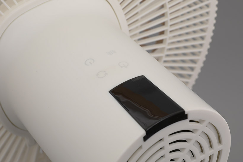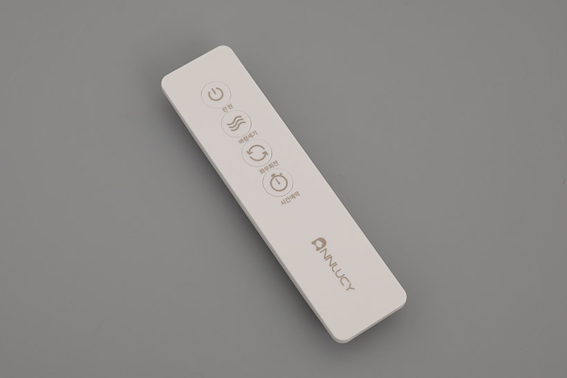그런데 보통 받침대 윗면에 있어야 할 조작부가 보이지 않는다. 앤루시 비스톰 리모컨 스탠드 써큘레이터 ASF-200R의 조작부는 특이하게도 본체의 모터가 들어 있는 하우징 윗면에 위치해 있다. 터치 방식의 버튼은 전원과 풍량, 타이머, 회전 등 네 개로 이루어져 있다. 버튼 뒤에 있는 검은색 부분은 설정 상태를 알려주는 디스플레이이다.