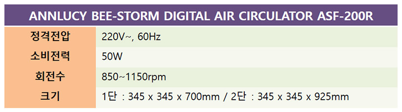 서큘레이터는 날개를 회전시켜서 바람을 만들어낸다는 점에서 선풍기와 비슷하지만, 선풍기보다 직진성이 훨씬 높아서 멀리까지 바람을 보내 실내 공기를 순환시키는 역할을 하기 때문에 여름철 냉방이나 겨울철 난방과 함께 사용하면 냉난방기와 거리가 먼 구석 공간까지도 효과를 볼 수 있다. 앤루시 비스톰 리모컨 스탠드 써큘레이터 ASF-200R은 높이 조절 기능과 좌우 자동 회전 기능에 3단계 풍량 조절 기능으로 실내 냉난방의 효율을 더욱 높여준다.