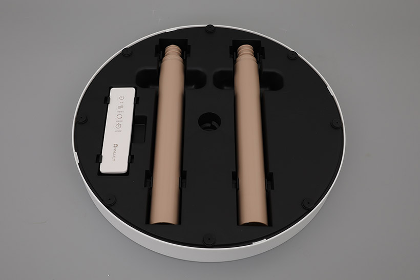 받침대는 가운데 구멍이 난 흰색 원판 모양인데, 뒤집어보면 밑바닥 부분에 두 개의 연장봉과 리모컨이 끼워져 있는 것을 확인할 수 있다.