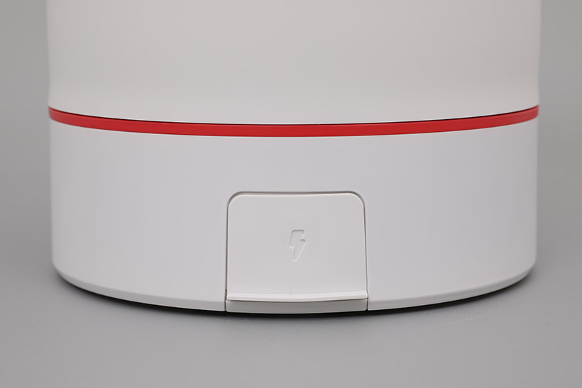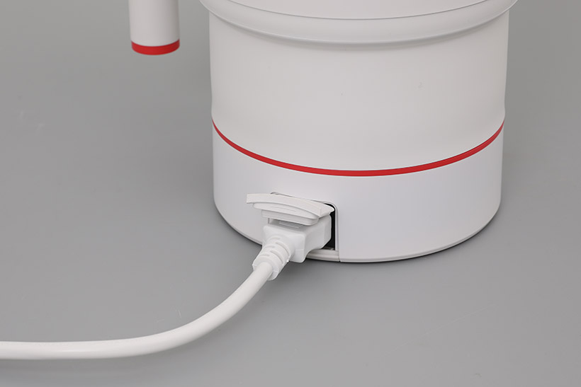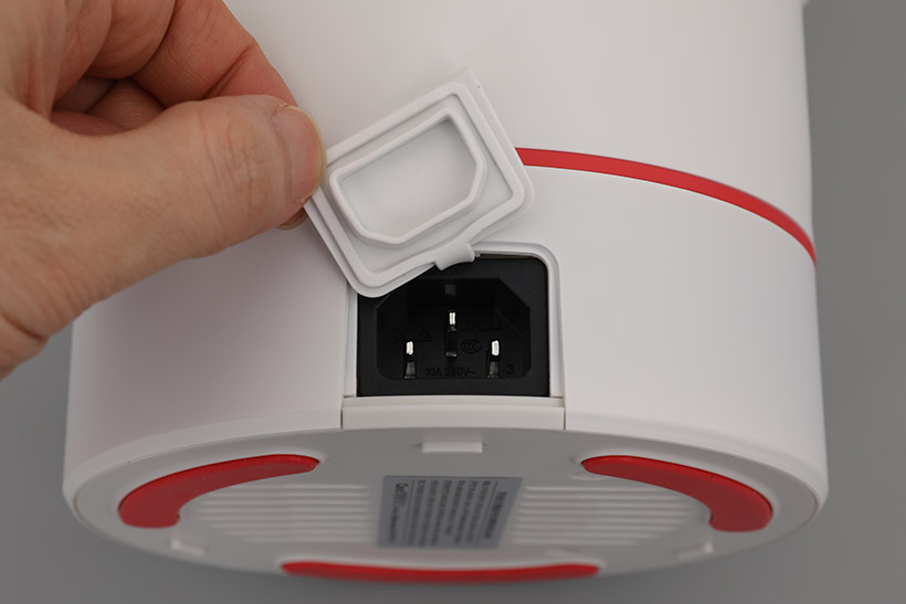 뒷면에도 가려져 있던 부분이 나타나는데, 실리콘 커버로 막혀 있는 전원 연결 단자이다. 사용 시에는 커버를 열고 전원 코드를 연결해야 하지만, 사용 후에는 커버를 닫아서 물이 들어가지 못하도록 한 상태로 세척할 수 있다.