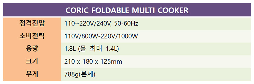 여행을 가서 숙소에 묵으면 대부분 전기포트가 기본 제공되어서 객실에서 커피나 차를 끓여 마실 수 있으며, 간단하게 컵라면을 끓여 먹을 때도 유용하다. 하지만 포트 관리가 잘 되고 있는지, 이전 사용자가 엉뚱한 용도로 사용하지는 않았는지 걱정이 되기도 한다. 개인용 전기포트를 챙겨 가면 걱정이 없겠지만, 큰 부피 때문에 챙겨 가기도 쉽지 않다. 코릭 접이식 멀티쿠커는 작게 접어 가방에 쏙 넣고 사용할 때는 펼쳐서 대용량으로 쓸 수 있는 제품이다.
