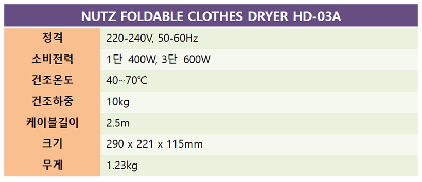 너츠 의류 건조기 HD-03A는 2단 건조기능에 UV 살균 기능까지 추가해 대장균과 포도상구균을 99.9% 살균해주기 때문에 어린아이들이 있는 가정이라면 더욱 유용하게 쓸 수 있다. 또한 1.5kg의 가벼운 무게로 가정에서만이 아니라 출장이나 여행 시에도 휴대가 가능하며, 넉넉한 건조 용량으로 여러 벌의 옷을 동시에 살균 건조할 수 있다는 점도 상당히 만족스럽다. 여기에 저전력 고효율 설계와 간편한 사용법 등으르 더욱 만족감을 높여줄 것으로 기대된다.