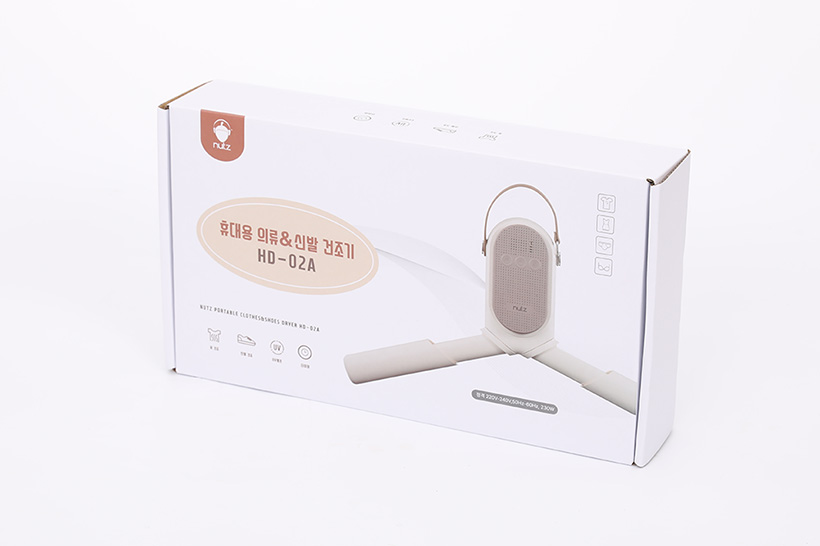 너츠 휴대용 신발 의류 건조기 HD-02A는 흰색 박스 패키지에 담겨 있다. 박스 앞면에는 제품의 컬러 이미지를 비롯해 특징까지 표시되어 있어서 개봉 전에도 디자인이나 정보를 미리 알아볼 수 있다.