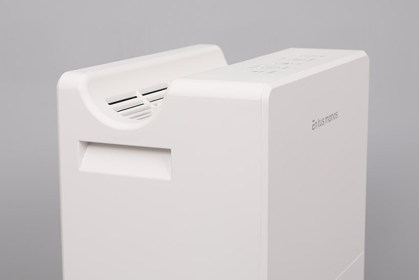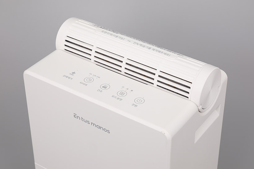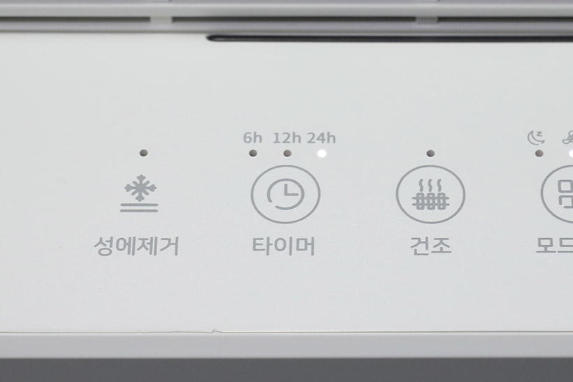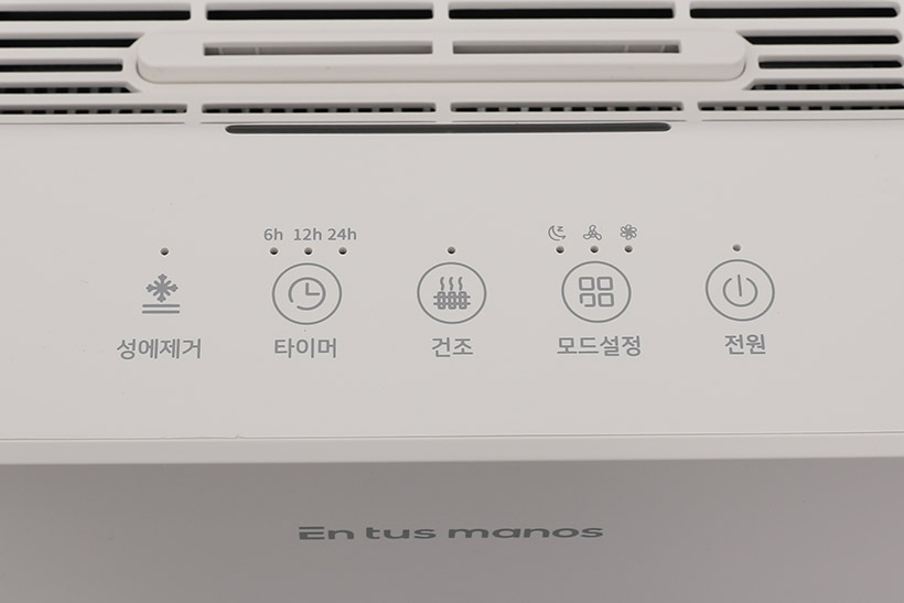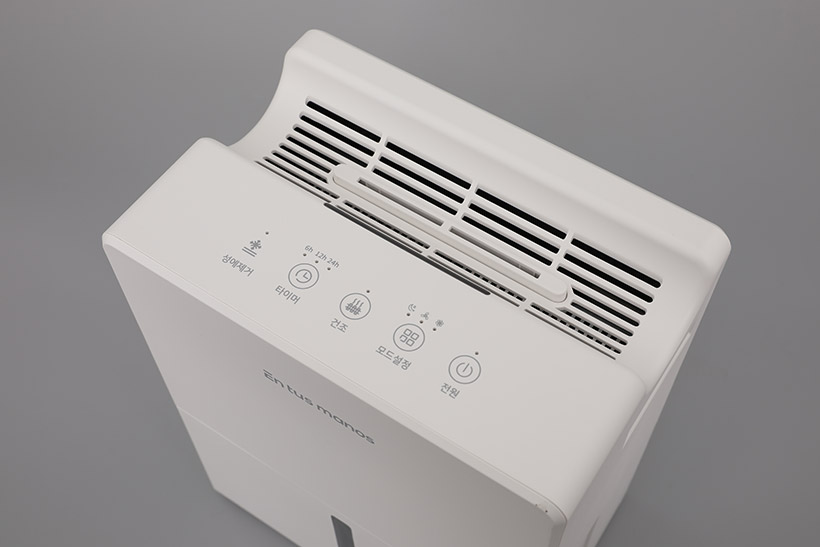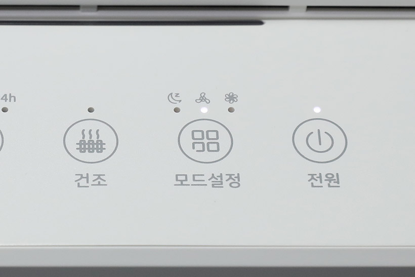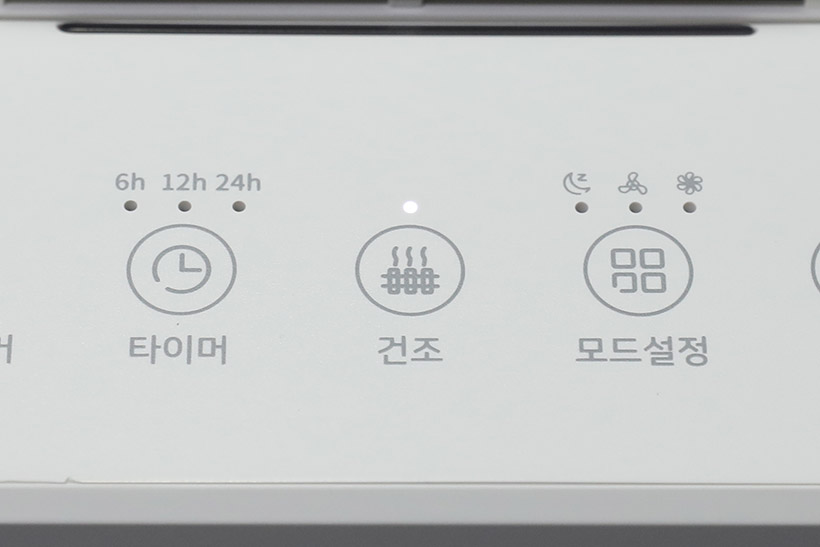 윗면의 공기 배출구 앞쪽에는 컨트롤 패널이 위치해 있다. 컨트롤 패널에는 전원 버튼과 모드 설정 버튼, 건조 버튼, 타이머 버튼 등이 있으며, 각 버튼에는 LED 표시등이 함께 자리 잡고 있다.