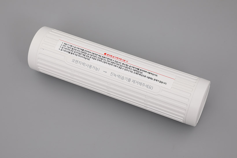 제습 실린더 윗면에는 사용 설명이 스티커로 부착되어 있는데, 오렌지색일 때 사용 가능하고 진녹색일 때 습기를 제거해달라는 문구가 보인다.