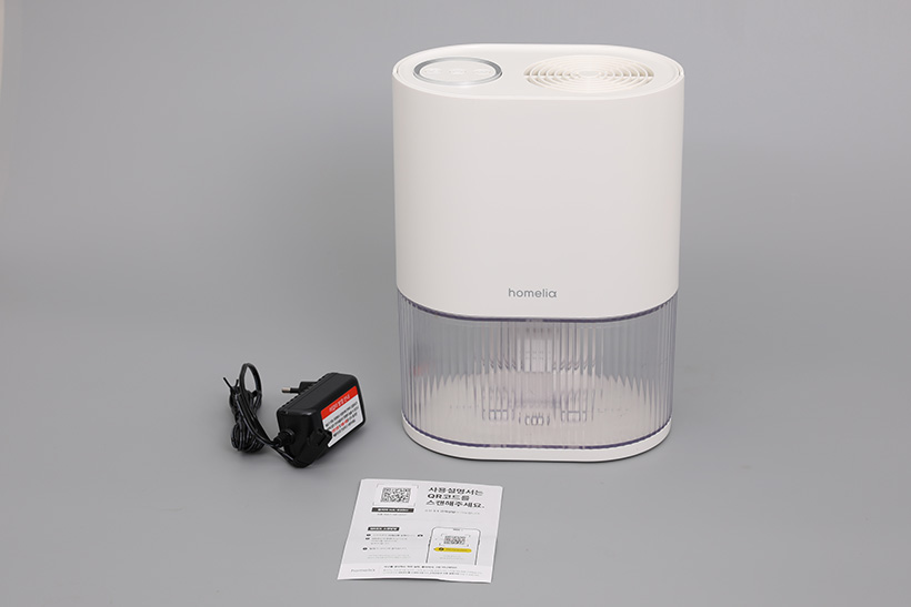 홈리아 2L 저소음 공기청정 미니 제습기 에어라이트 HA-02DH는 갈색의 골판지 박스 패키지를 사용하고 있다. 상자 안에는 완충재가 제품을 보호해주고 있으며, 구성품으로는 홈리아 2L 저소음 공기청정 미니 제습기 에어라이트 HA-02DH 본체와 전원 어댑터, 그리고 보증서가 제공된다. 사용 설명서는 별도로 제공되지 않으며, QR코드 방식으로 보증서 뒷면에 표시되어 있다.