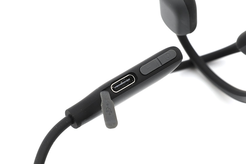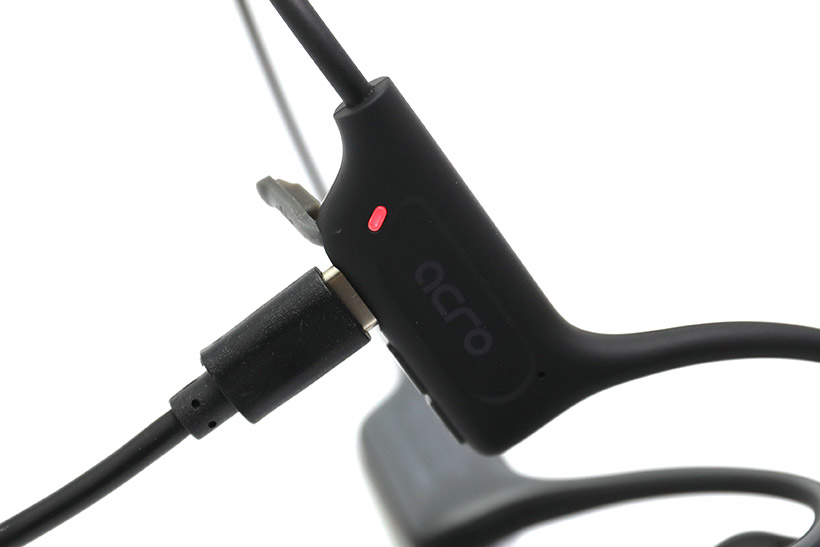 실리콘 커버를 벗겨보면 USB C타입 규격의 충전 단자가 나타난다. 아크로 골전도 블루투스 무선 이어폰 MI6-001은 IPX4 등급의 생활 방수를 지원하기 때문에 운동 중 흘리는 땀이나 약한 비가 내리는 상황에서는 걱정 없이 사용할 수 있지만, 충전이 완료되면 사용 시 단자 커버를 정확히 씌워주어야 방수 기능을 제대로 활용할 수 있다.