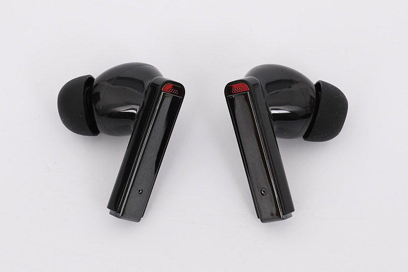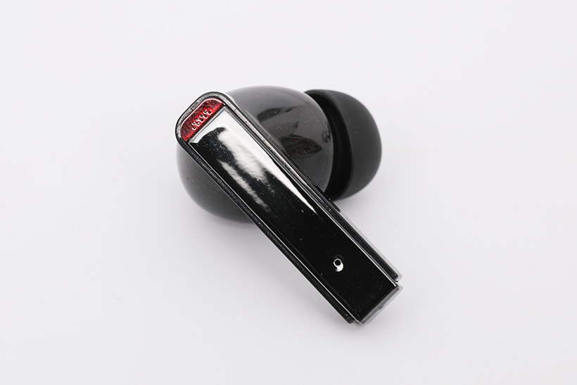 이어폰의 다리 부분 바깥쪽을 보면 제일 위쪽 포인트 컬러 부분에 여러 개의 타공이 들어간 것이 보이는데, 그 뒤로 마이크가 내장되어 있다. 다리 부분 아래쪽에 있는 작은 구멍은 상태 표시 LED이며, LED와 마이크 사이 평평한 부분은 이어폰을 조작하기 위한 터치 컨트롤 영역이다.