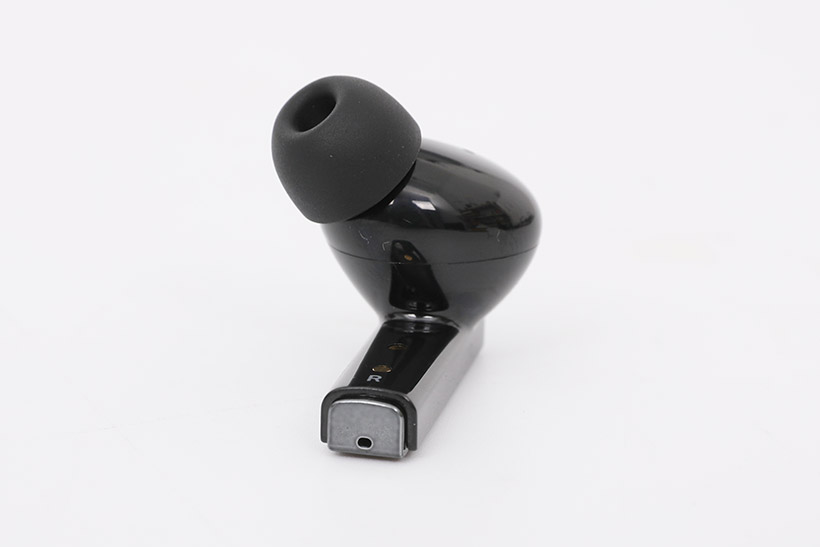 이어폰의 다리 부분 안쪽 면에는 충전 시 포고핀과 접촉하는 금속 접점 두 개가 보이고, 그 아래로 좌우 표시가 인쇄되어 있다. 또한 이어팁 바로 뒤 하우징에는 내부의 이압을 줄여주는 용도의 덕트가 뚫려 있는 것도 확인할 수 있다.
