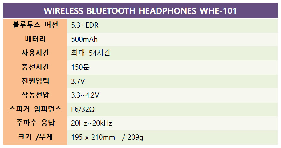 구성품으로는 아크로 블루투스 무선 헤드폰 WHE-101 본체와 케이스, 충전용 USB 케이블과 3.5㎜ AUX 케이블, 그리고 사용 설명서가 기본 제공된다.