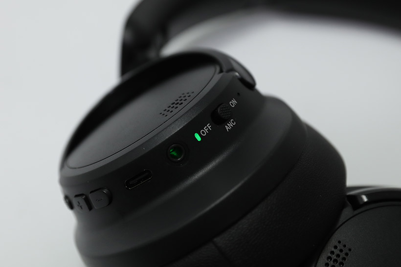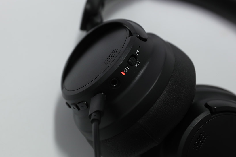 아크로 블루투스 무선 헤드폰 WHE-101은 오른쪽 하우징 아래쪽에 입출력 단자와 컨트롤 버튼이 모두 모여 있다. 유선 연결을 위한 AUX 단자 옆에는 ANC 기능을 켜고 끄는 스위치가 있으며, 스위치와 AUX 단자 사이에는 상태 표시등이 보인다.