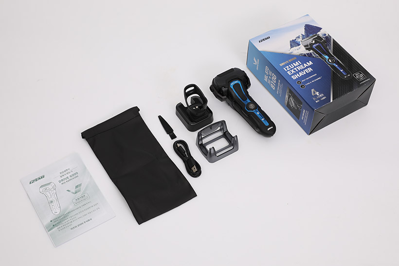 구성품으로는 이즈미 전기 면도기 전동 익스트림 쉐이버 IKS-6200 본체와 충전 스탠드, 건조용 홀더, 청소용 브러시, 충전용 USB 케이블, 파우치, 그리고 사용 설명서가 제공된다.