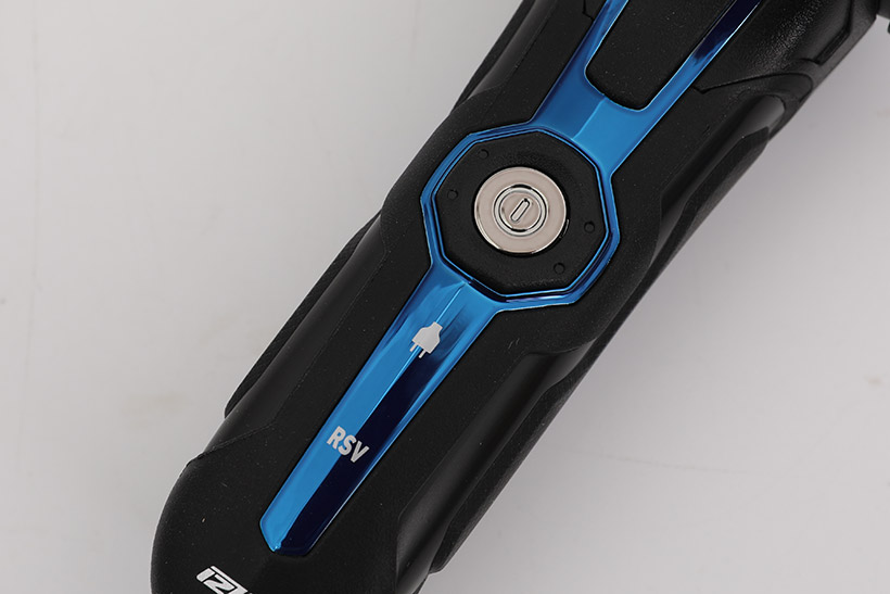 손잡이 부분 중앙에는 동그란 은색 전원 버튼이 있고, 버튼 아래로 전원 플러그 이미지와 RSV라는 글자가 보인다. 전원 플러그 이미지는 충전이나 전원 관련 상태를 표시하는 LED 표시등이며, RSV는 리저브 운전 기능이 작동될 때 켜지는 LED 표시등이다.