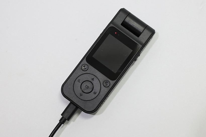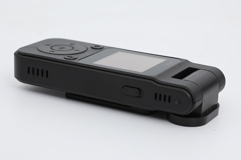크로니클 초간편 버튼 디스플레이 바디캠의 렌즈부는 고정된 타입이 아니라 회전이 가능한 구조로 되어있어서 렌즈를 디스플레이 방향으로 회전시키거나 위쪽을 향하게 해서 삼각대 거치나 바닥에 내려놓은 상태로도 사용할 수 있다.