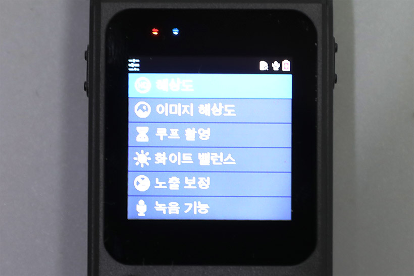 메뉴 버튼을 누르면 다양한 설정 메뉴를 확인할 수 있다. 설정 메뉴는 동영상 해상도와 이미지 해상도, 루프 촬영, 화이트 밸런스, 노출 보정, 녹음 기능, 시간 표시, 버튼 소리, 시간 설정, 자동 종료, 언어 설정, 주파수, 자동 화면 꺼짐, 포맷, 시스템 재설정, 소프트웨어 버전 등이 제공된다.