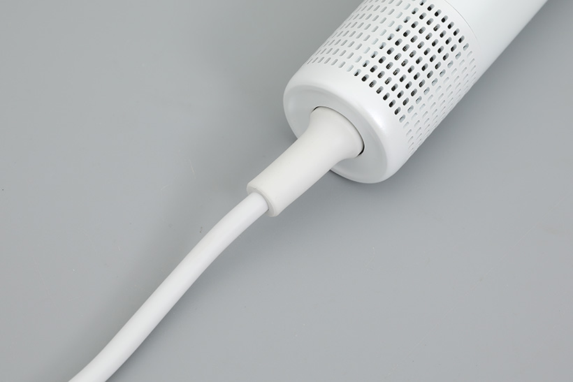 공기 흡입구 바로 아래에는 전원 케이블이 연결되어 있으며, 연결부에는 스트레인 릴리프로 보강되어 있어서 연결부가 꺾이거나 당겨지면서 내부 단선이 생기는 것을 방지해준다.