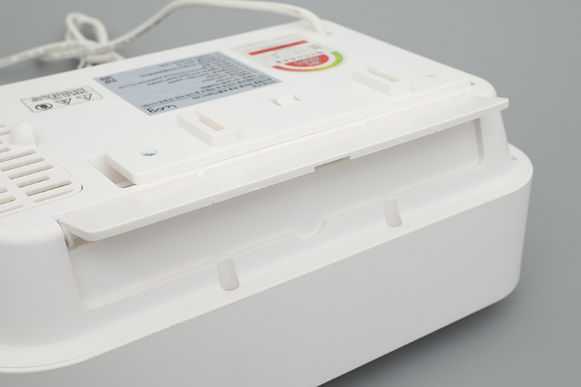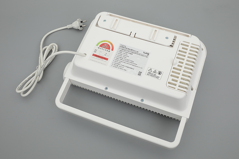 아이랩 따숨 순간발열 무타공 욕실 온풍기 뒷면에는 모델명과 인증 정보가 담긴 스티커가 가운데에 부착되어 있으며, 에너지 소비효율 스티커도 바로 옆에 부착되어 있다. 전원 코드는 일체형으로, 길이가 약 1.5m 가량으로 넉넉하기 때문에 여유롭게 설치할 수 있다.