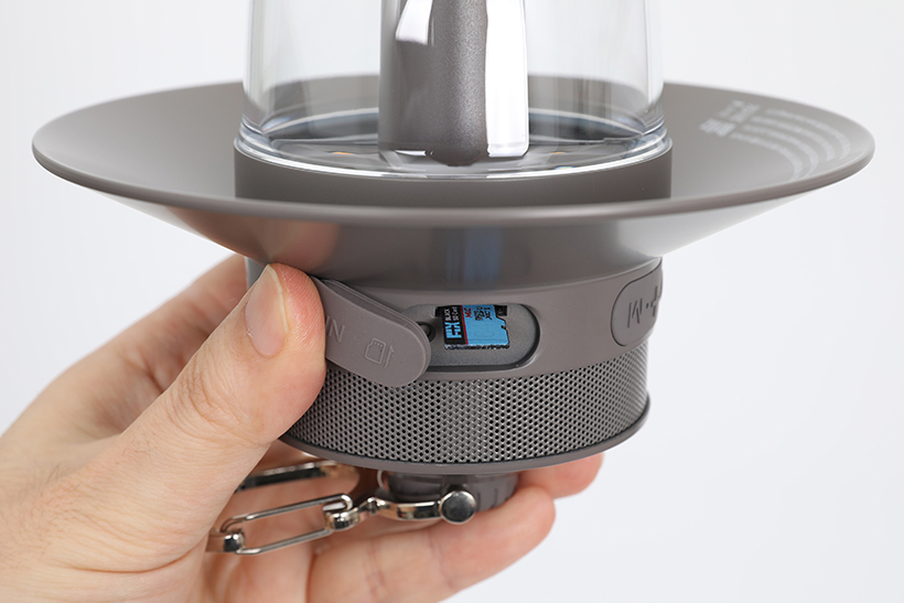 조작부 옆에는 타원형의 작은 덮개가 있는데, 열어보면 안쪽에 충전용 USB 포트와 마이크로SD 슬롯이 나타난다. 음원이 저장되어 있는 마이크로SD 메모리를 삽입하면 재생이 가능하다는 것을 짐작할 수 있다.