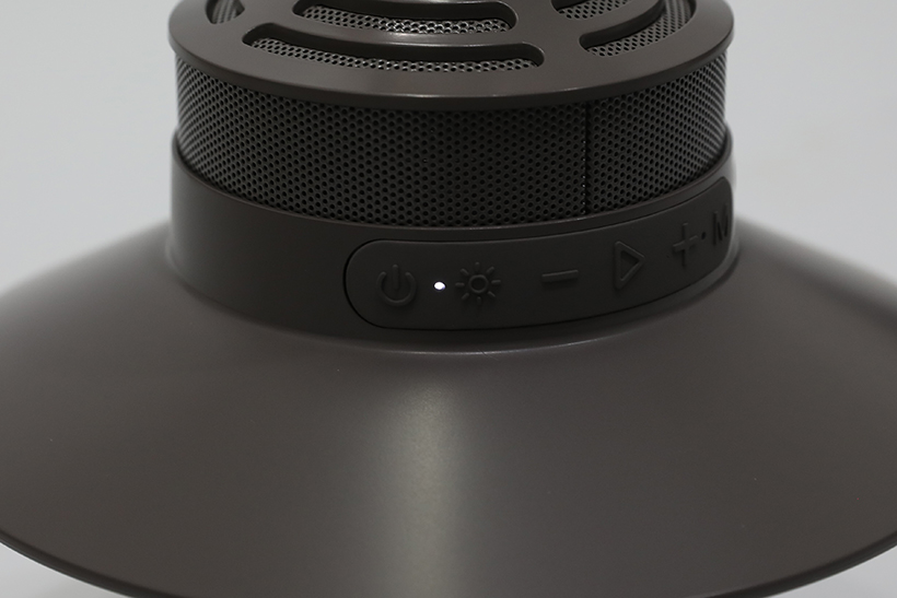 본체 윗부분에는 내장된 스피커 유닛의 그릴이 타공망 형태로 적용되어 있으며, 본체 제일 윗부분에는 본체를 걸어두기 위한 카라비너가 장착되어 있다.
