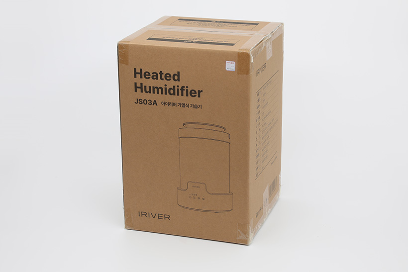 아이리버 가열식 가습기 JS03A는 갈색 골판지 박스에 담겨있다. 박스의 옆면에는 제품의 이미지가 라인아트로 인쇄되어 있으며, 정품 인증 홀로그램 스티커도 부착되어 있다.